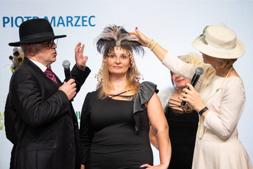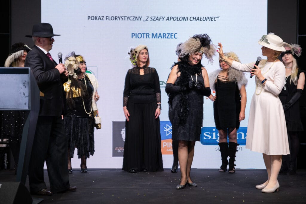 Piotr Marzec zaprezentował piękne nakrycia głowy na modelkach, które również są florystkami. Inspiracją do stworzenia prac była polska aktorka Apolonia Chałupiec z lat 20.